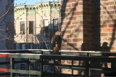 The light was great, so I snapped a few shots. He stayed there valiantly (though he did not deign to step out of that shadow crossing his body). I'll post a tighter shot when I get back to my computer at home, but I like the composition of this one. See the hawk's shadow on the brick wall to the right?